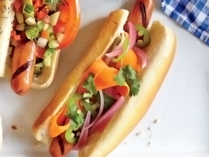 Vágjunk fel egy nagy fej vörös és egy nagy fej likhagymát, melyet nagyon csekély mennyiségű kókusz vagy olívaolajon karikára vágva pirítsunk meg. A kiflijeinket vágjuk ketté, majd helyezzünk beléjük egy-egy levél friss salátát. Erre helyezzünk néhány érett paradicsom szeletet, majd mehet bele a sült hagymaszelet is. A virslit főzés után egyből tegyük a hot-dogba, hogy még forrón tudjuk fogyasztani.